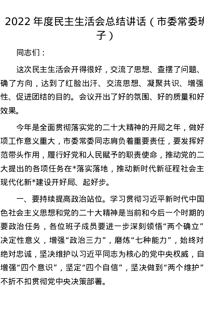 总结讲话:2022年度民主生活会总结讲话(市委常委班子)815字
