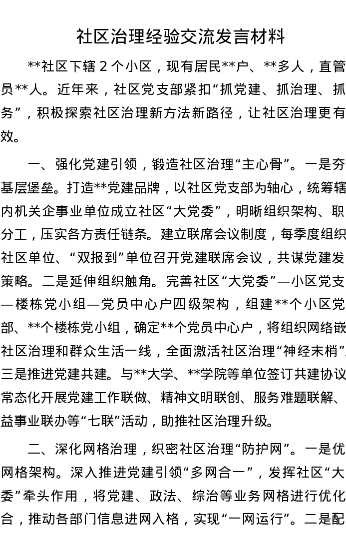 社区治理经验交流发言材料