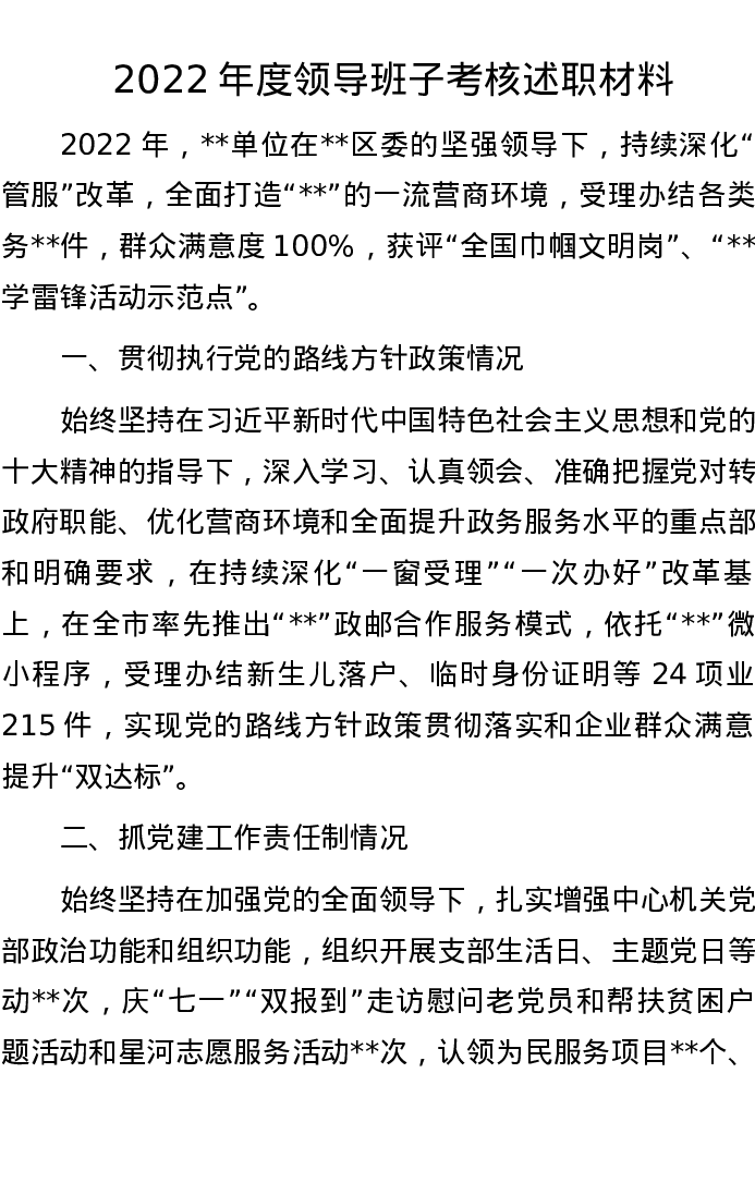 2022年度领导班子考核述职材料