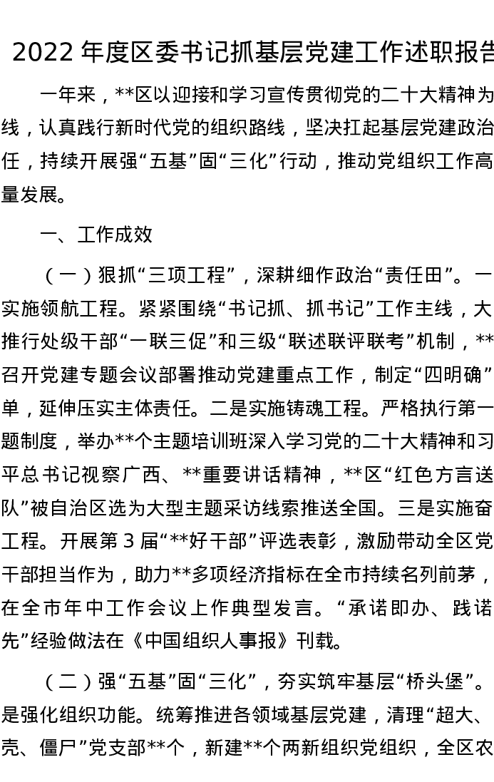 2022年度区委书记抓基层党建工作述职报告