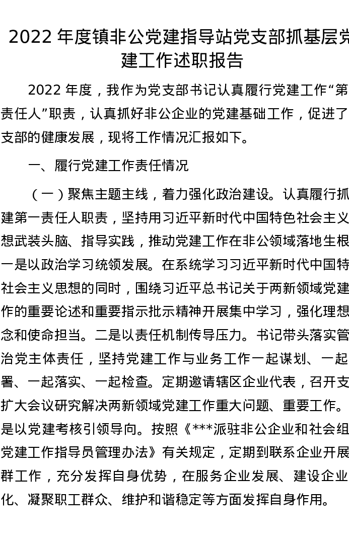 2022年度镇非公党建指导站党支部抓基层党建工作述职报告