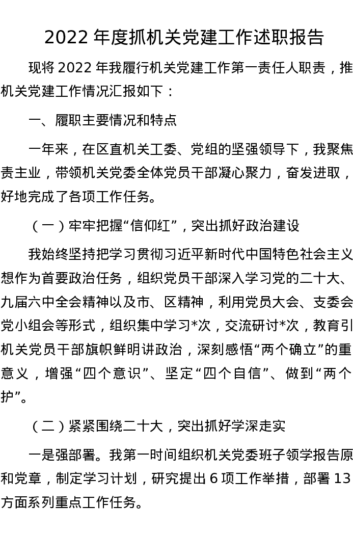 2022年度抓机关党建工作述职报告
