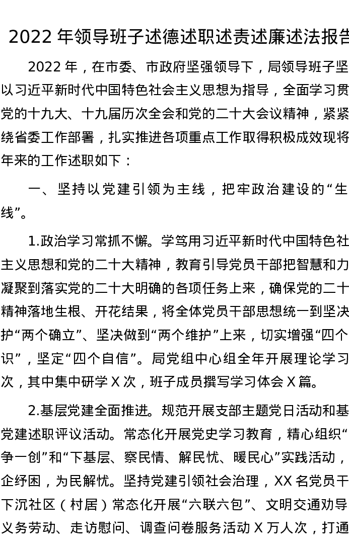 2022年领导班子述德述职述责述廉述法报告