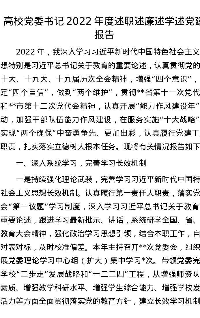 高校党委书记2022年度述职述廉述学述党建报告