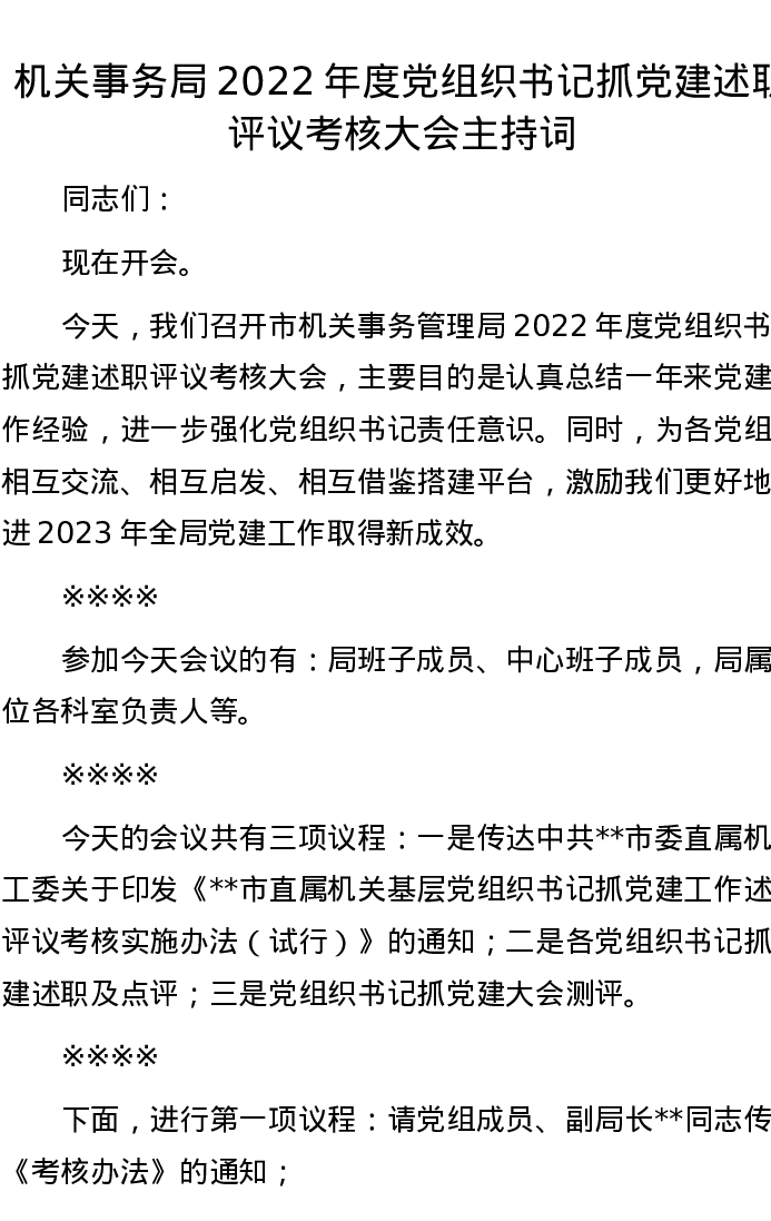 机关事务局2022年度党组织书记抓党建述职评议考核大会主持词
