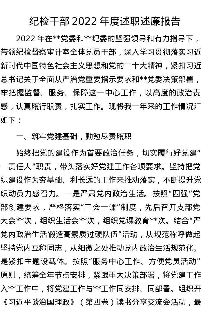 纪检干部2022年度述职述廉报告