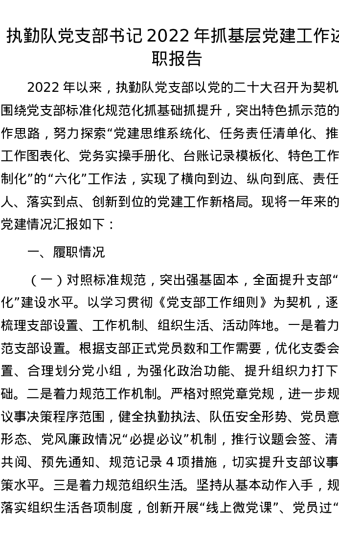 执勤队党支部书记2022年抓基层党建工作述职报告