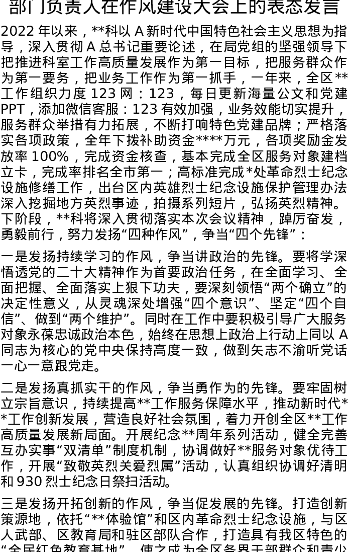 部门负责人在作风建设大会上的表态发言