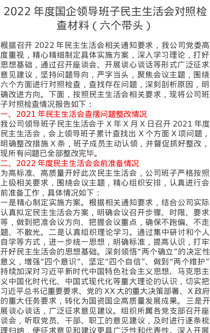 2022年度国企领导班子民主生活会对照检查材料(六个带头)