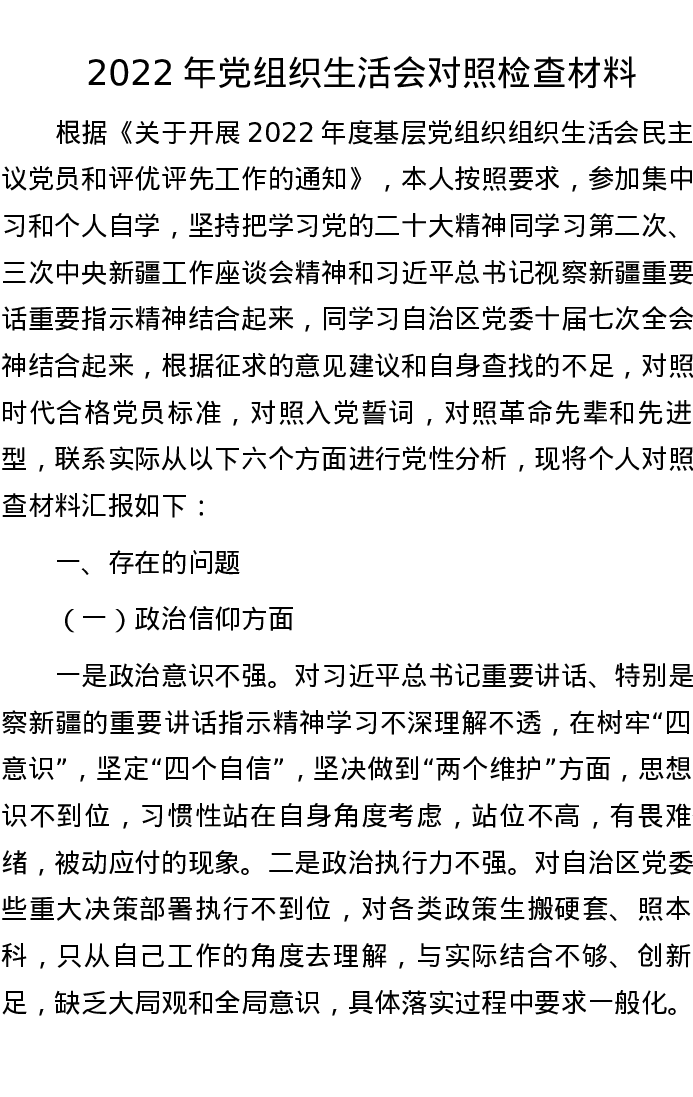 2022年党组织生活会对照检查材料