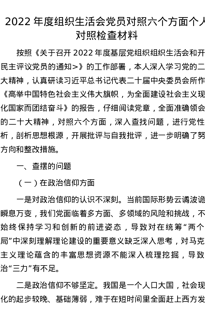 2022年度组织生活会党员对照六个方面个人对照检查材料