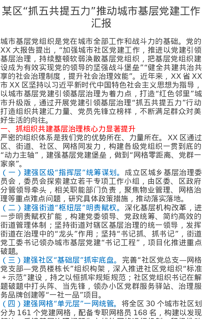 某区“抓五共提五力”推动城市基层党建工作汇报