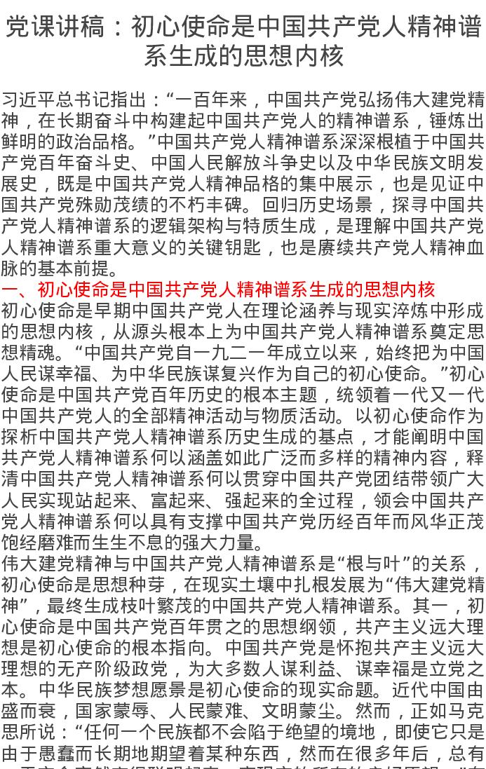 党课讲稿:初心使命是中国共产党人精神谱系生成的思想内核