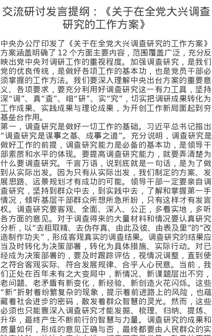 交流研讨发言提纲《关于在全党大兴调查研究的工作方案》