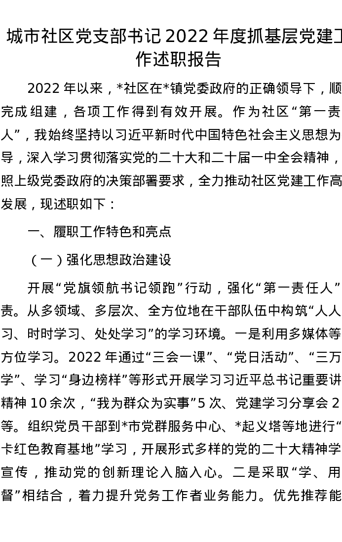 城市社区党支部书记2022年度抓基层党建工作述职报告