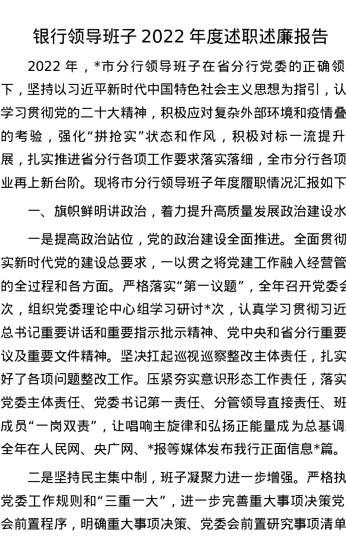 银行领导班子2022年度述职述廉报告