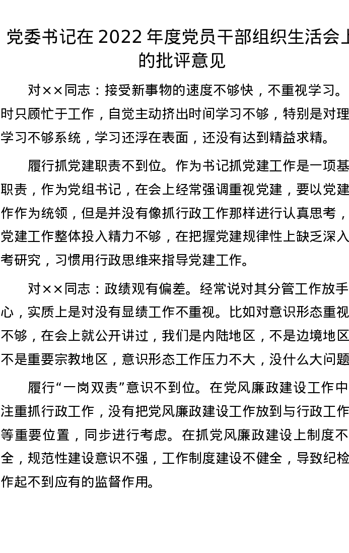 党委书记在2022年度党员干部组织生活会上的批评意见