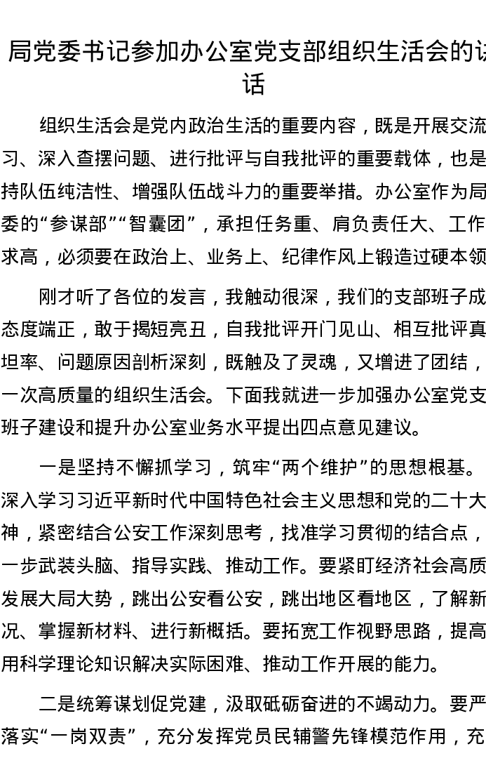 局党委书记参加办公室党支部组织生活会的讲话