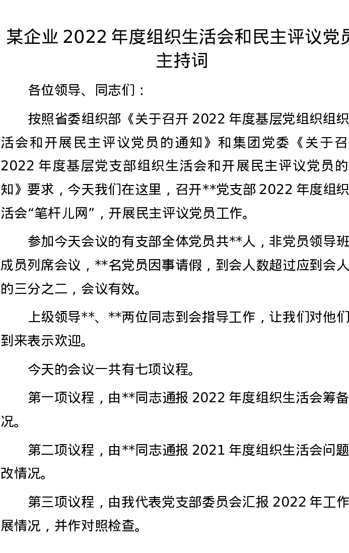 某企业2022年度组织生活会和民主评议党员主持词