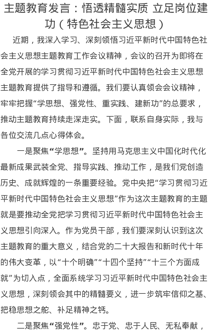 主题教育发言悟透精髓实质立足岗位建功特色社会主义思想