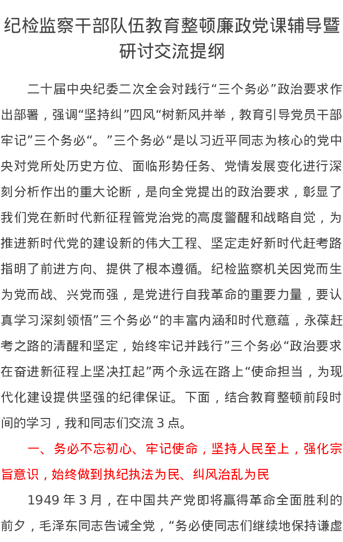 纪检监察干部队伍教育整顿廉政党课辅导暨研讨交流提纲