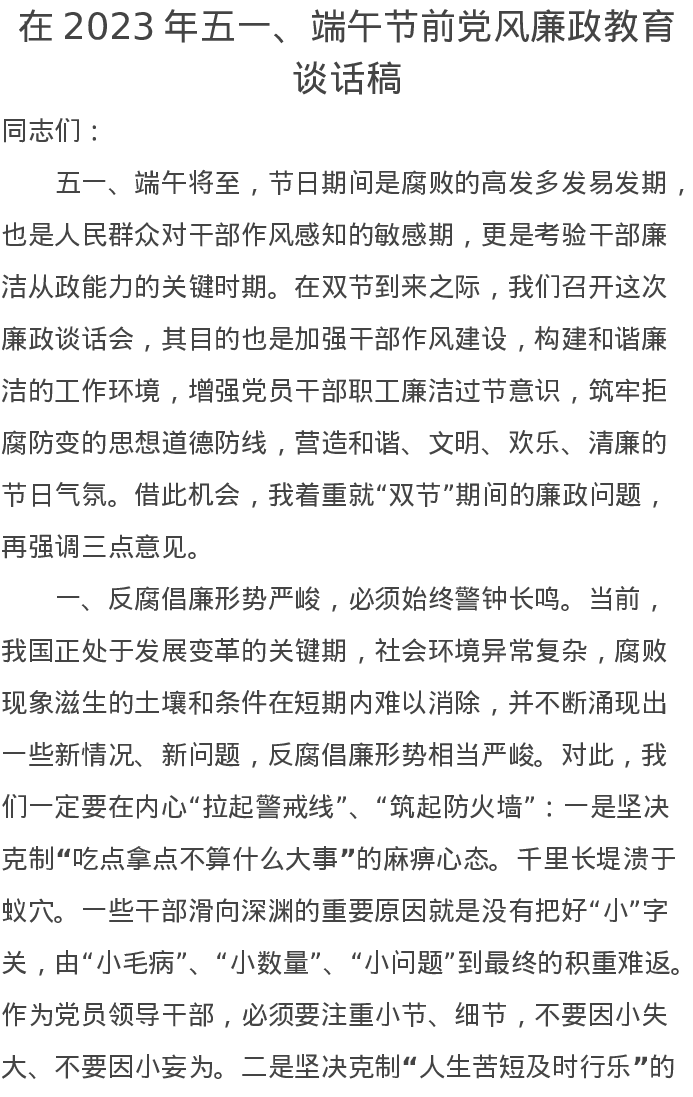 在2023年五一、端午节前党风廉政教育谈话稿
