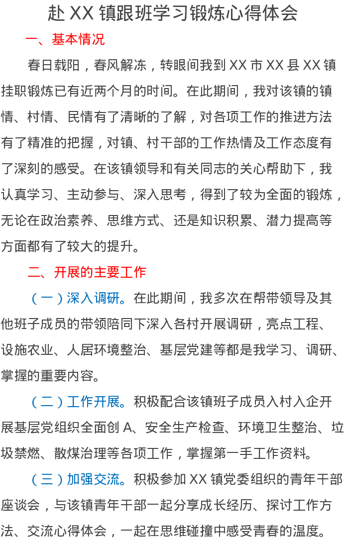 赴XX镇跟班学习锻炼心得体会