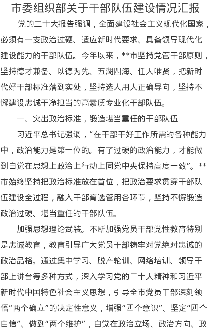 市委组织部关于干部队伍建设情况汇报