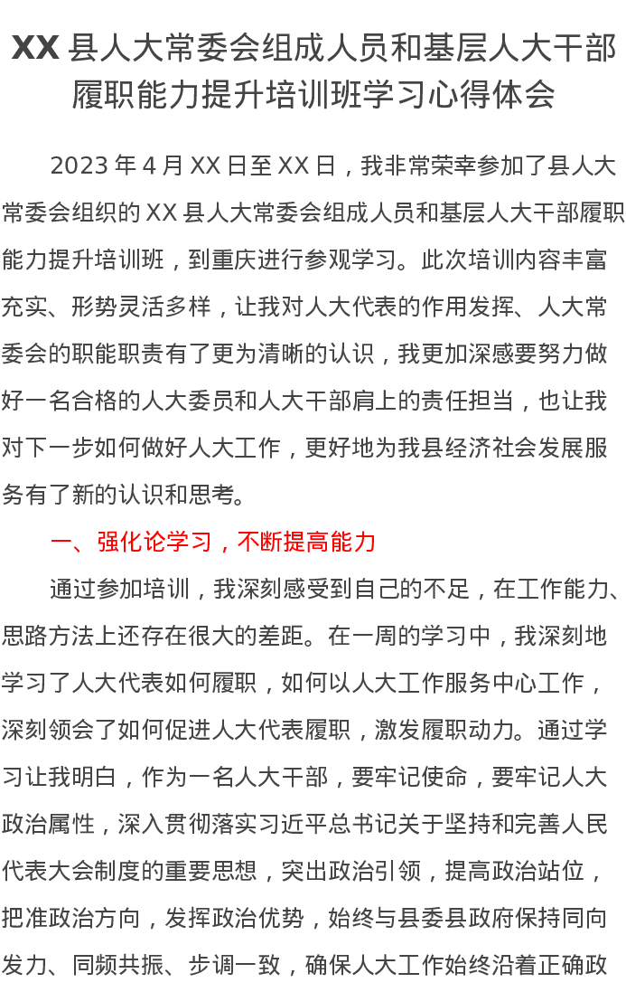 XX县人大常委会组成人员和基层人大干部履职能力提升培训班学习心得体会