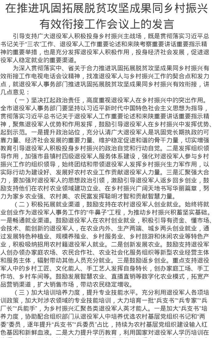 在推进巩固拓展脱贫攻坚成果同乡村振兴有效衔接工作会议上的发言
