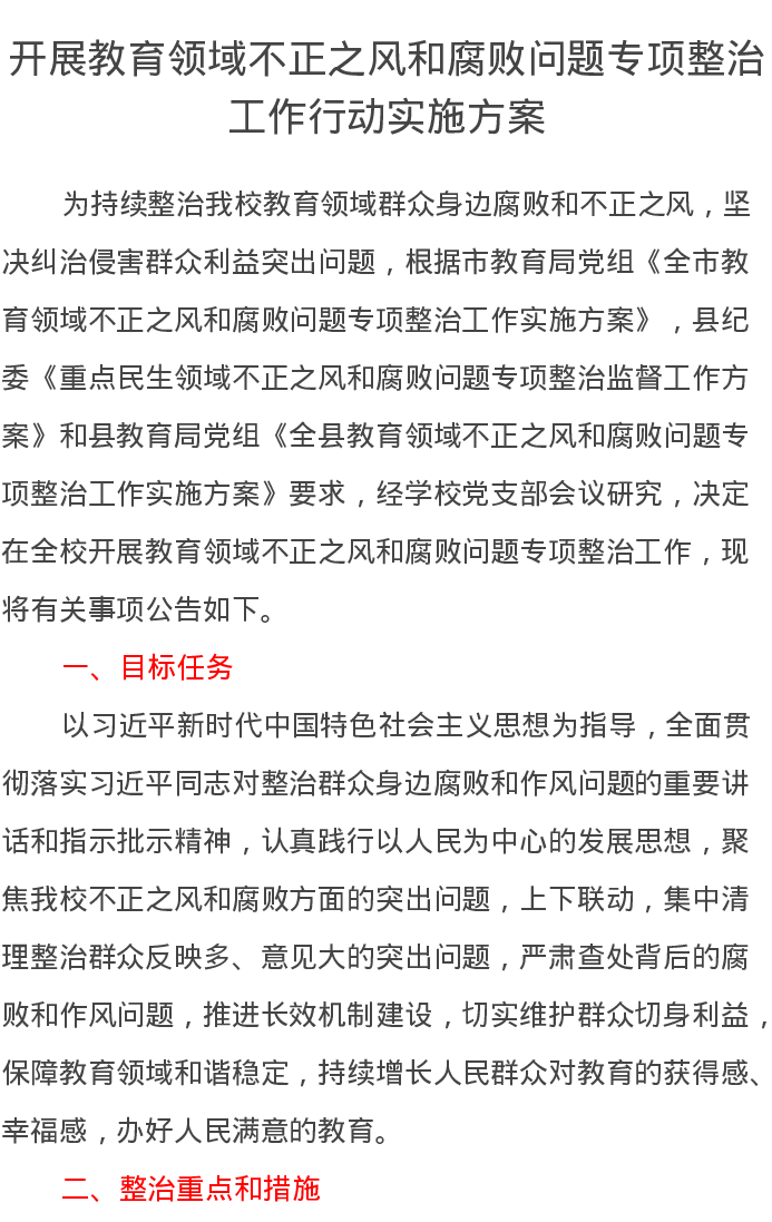 开展教育领域不正之风和腐败问题专项整治工作行动实施方案