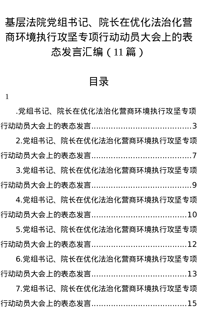 汇编:基层法院党组书记、院长在优化法治化营商环境执行攻坚专项行动动员大会上的表态发言11篇