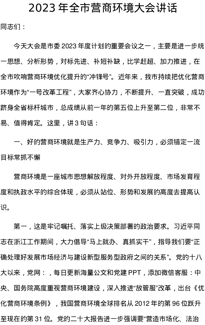 2023年全市营商环境大会讲话