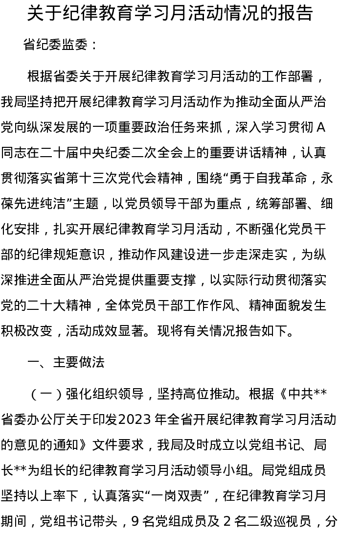 关于纪律教育学习月活动情况的报告