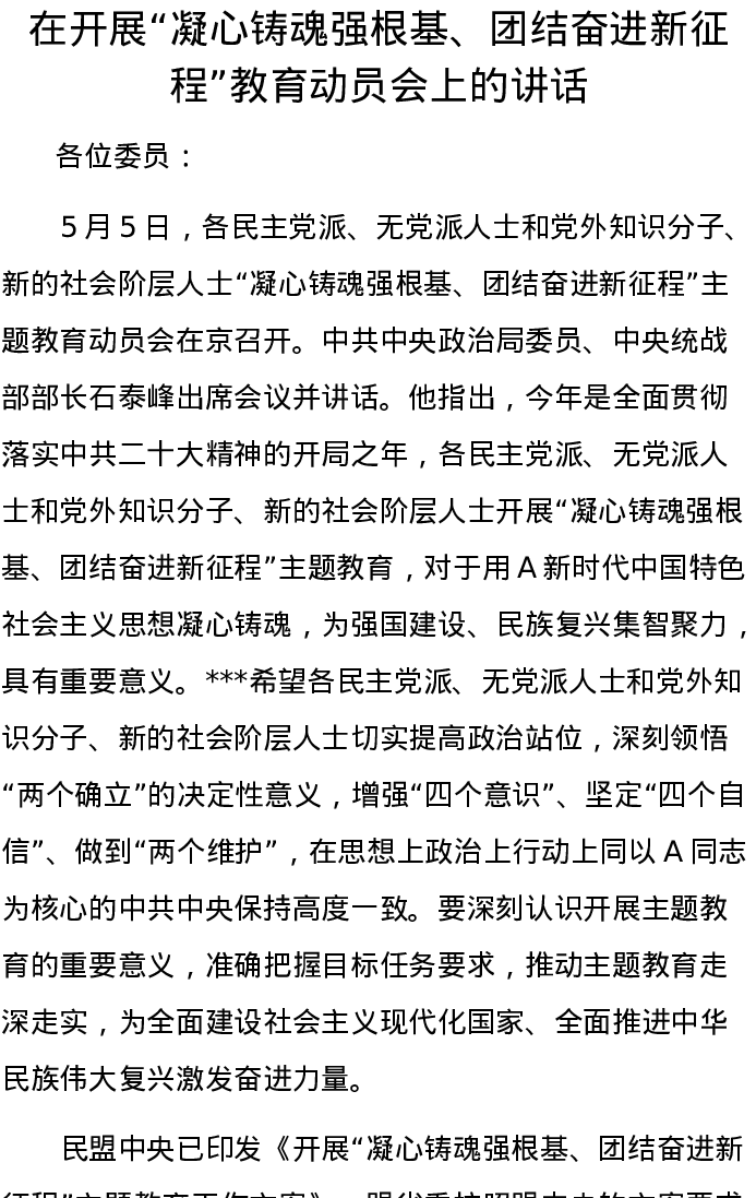 在开展“凝心铸魂强根基、团结奋进新征程”教育动员会上的讲话