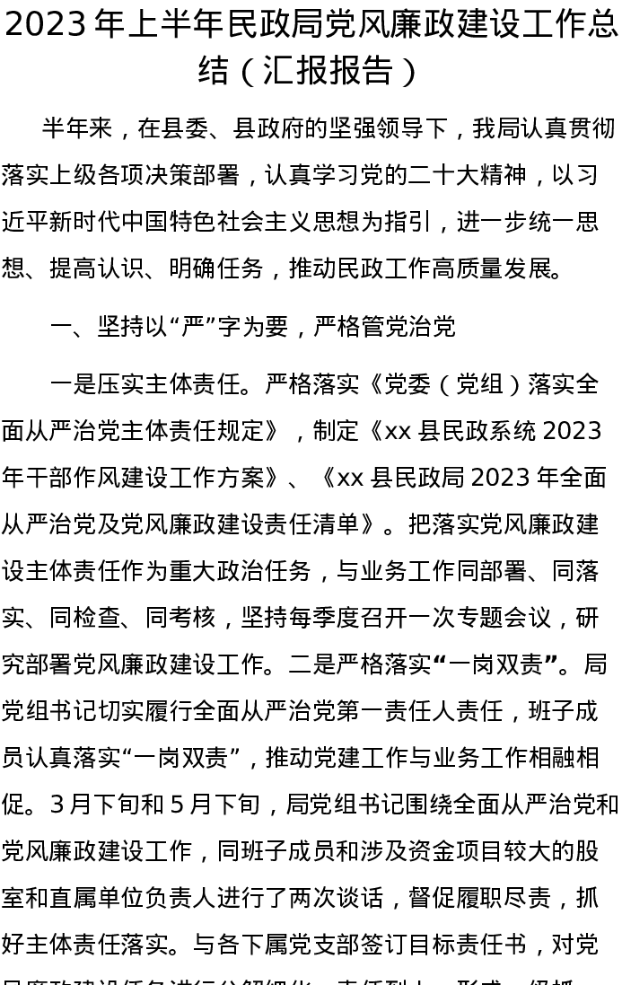 2023年上半年民政局党风廉政建设工作总结(汇报报告)