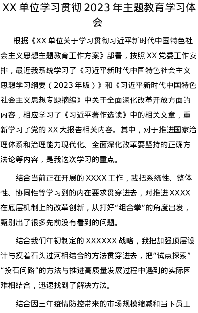 XX单位学习贯彻2023年主题教育学习体会特色社会主义思想