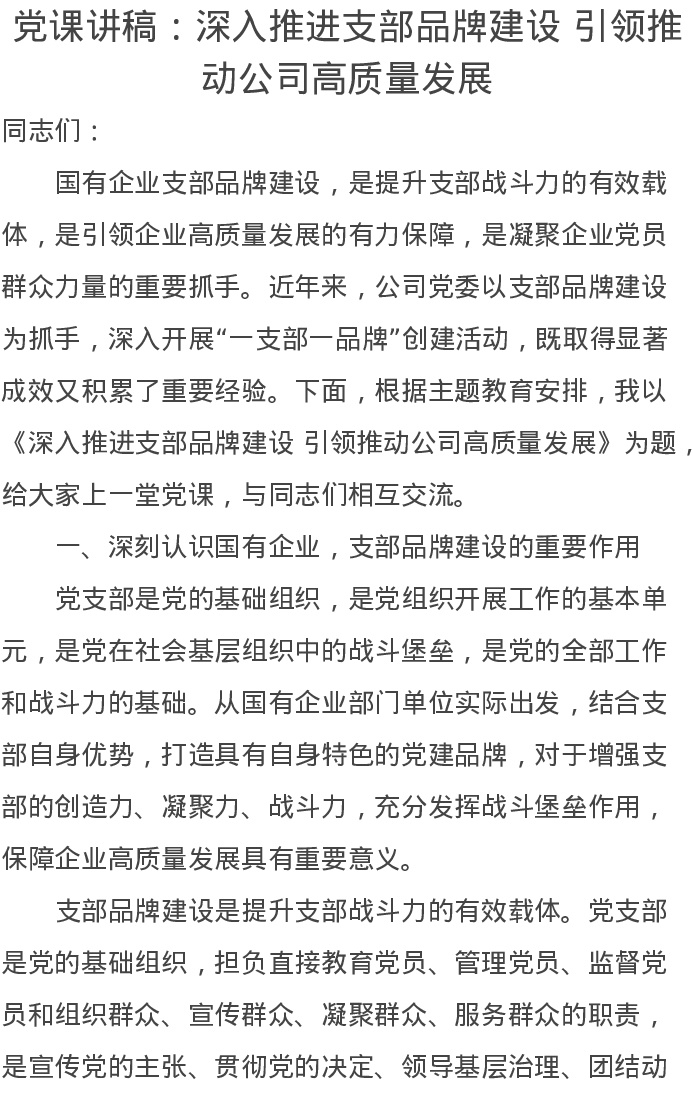 党课讲稿 深入推进支部品牌建设 引领推动公司高质量发展