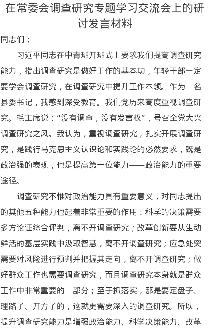 在常委会调查研究专题学习交流会上的研讨发言材料