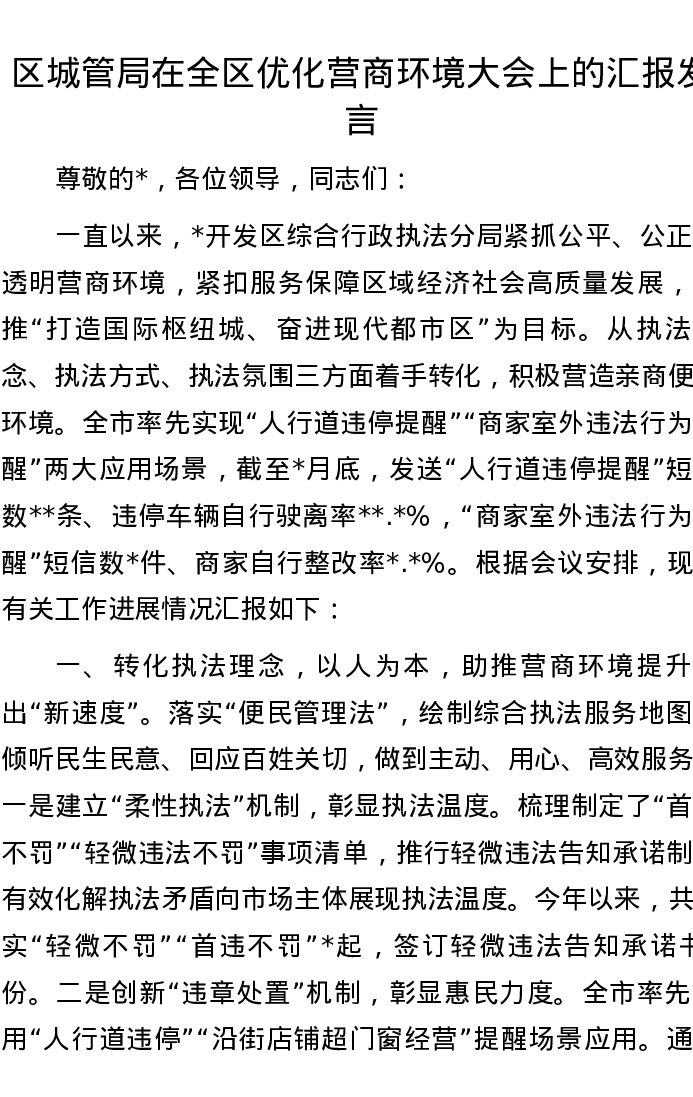 区城管局在全区优化营商环境大会上的汇报发言