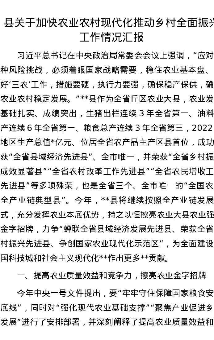 县关于加快农业农村现代化推动乡村全面振兴工作情况汇报