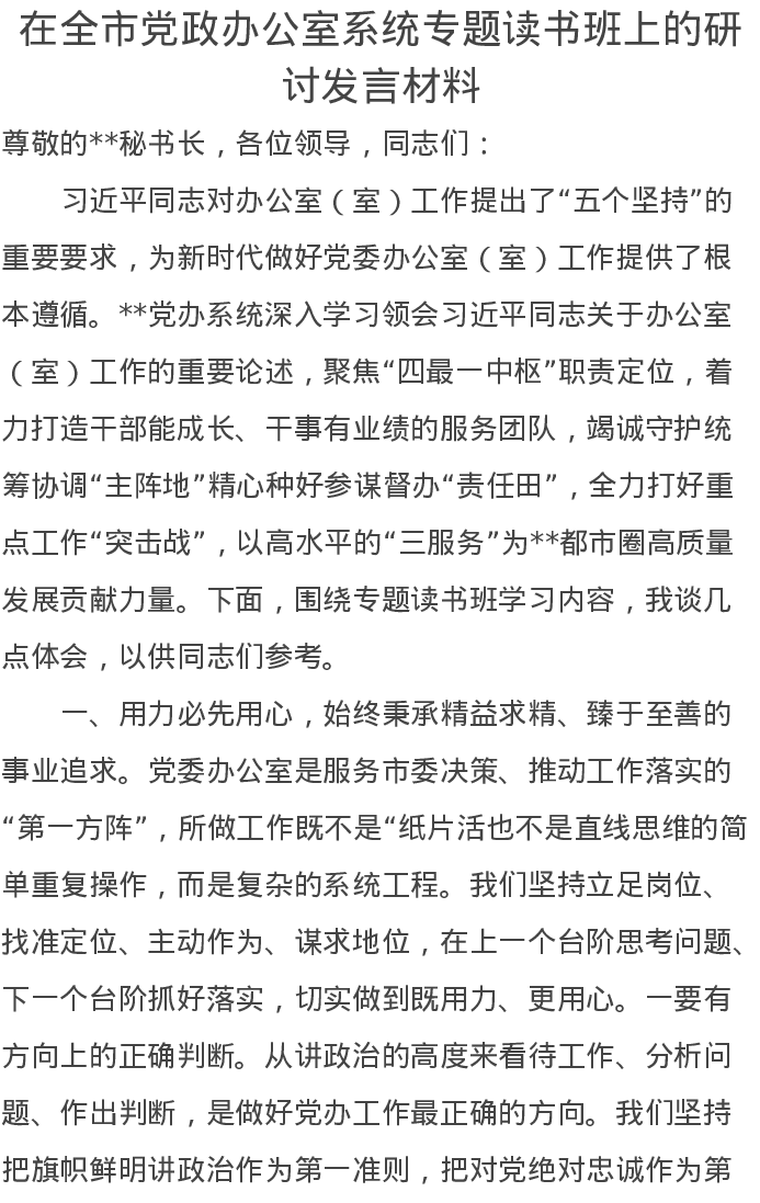 在全市党政办公室系统专题读书班上的研讨发言材料
