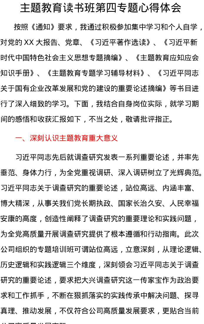 主题教育读书班第四专题心得体会-国企改革发展和党的建设1 特色社会主义思想