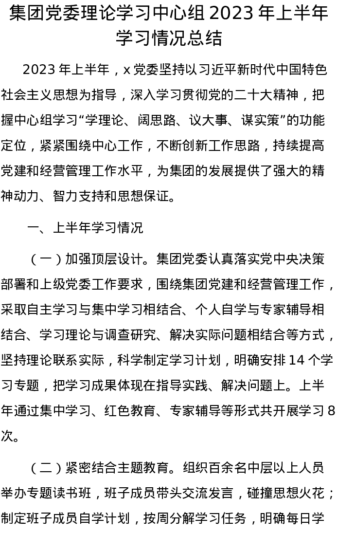 集团党委理论学习中心组2023年上半年学习情况总结