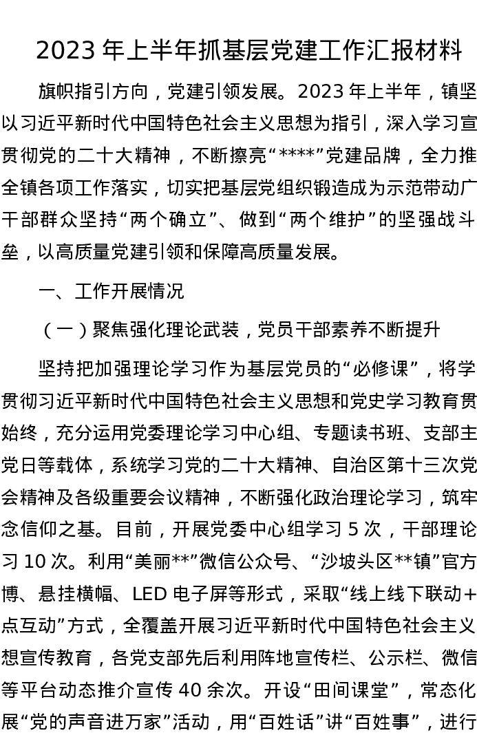 2023年上半年抓基层党建工作汇报材料