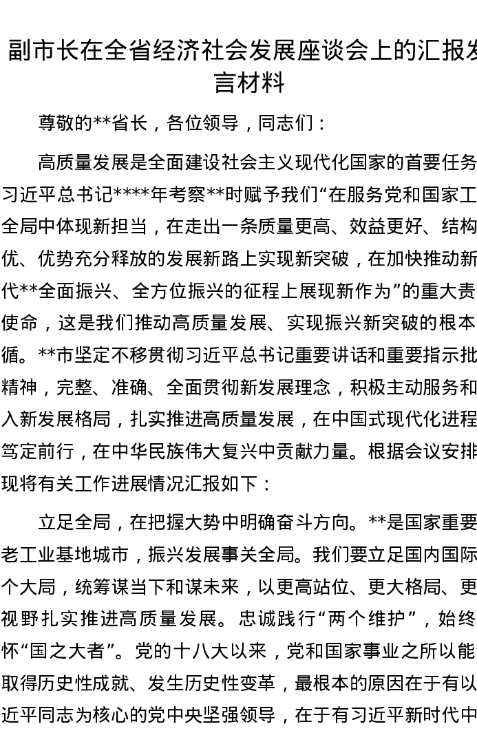 副市长在全省经济社会发展座谈会上的汇报发言材料
