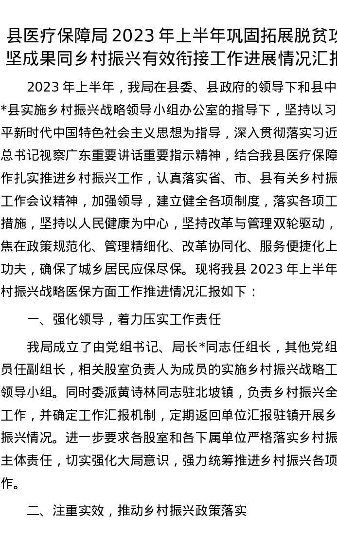 县医疗保障局2023年上半年巩固拓展脱贫攻坚成果同乡村振兴有效衔接工作进展情况汇报