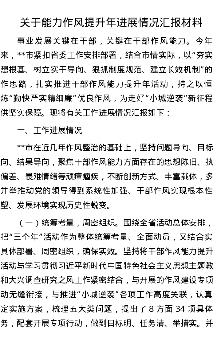 关于能力作风提升年进展情况汇报材料