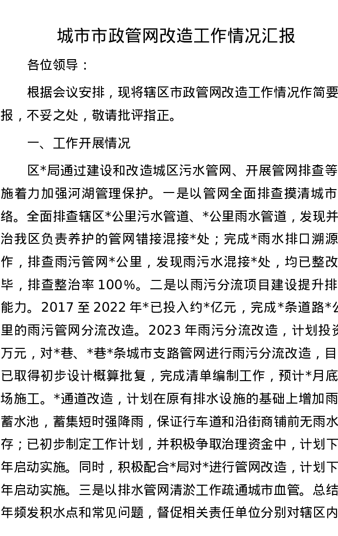 城市市政管网改造工作情况汇报