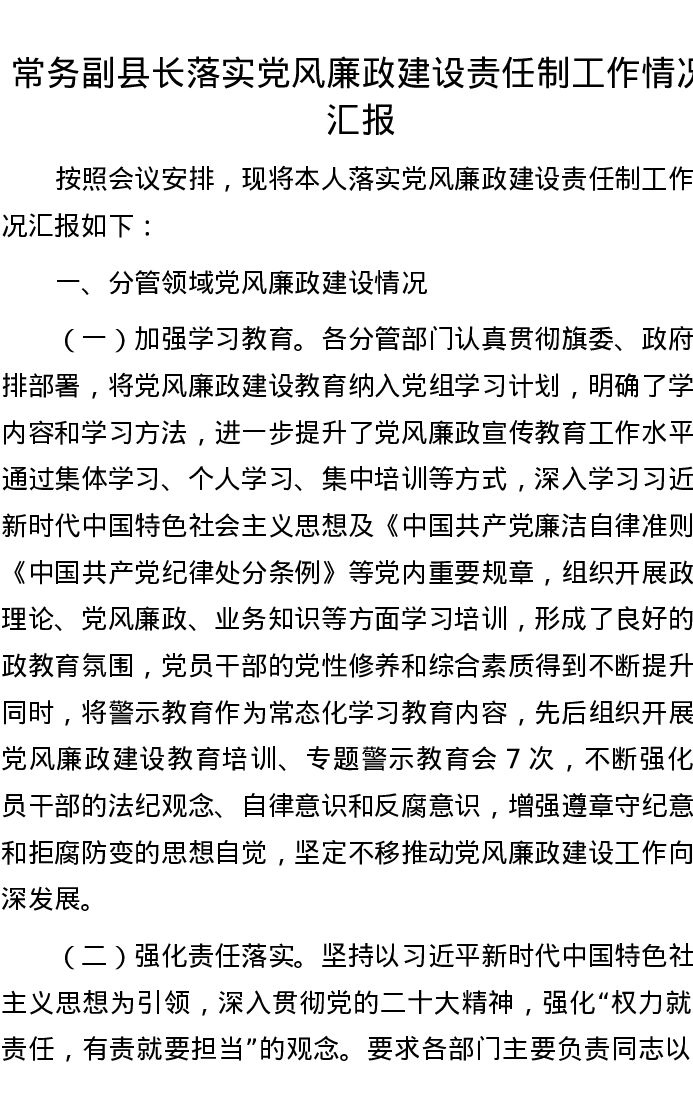 常务副县长落实党风廉政建设责任制工作情况汇报
